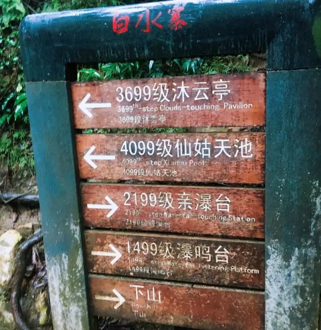 景點(diǎn)指示牌。說(shuō)實(shí)在走到這里挺累的,但是森榮的人豈會(huì)在此折戟沉沙,吾等將苦困化為舟船,以盼望一覽仙境當(dāng)作劃槳,渡過(guò)這漫長(zhǎng)又濕滑的臺(tái)階長(zhǎng)河!