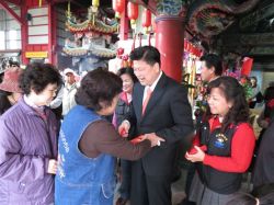 花蓮縣長傅昆萁今天由縣府民政處副處長蕭明甲、警察局長艾鵬、市長田智宣及多位民意代表陪同,前往花蓮市帝君廟、城隍廟、福安廟、吉安鄉勝安宮、慈惠堂、慈安宮等六座宮廟發放「十全十美」福袋,祝福每位鄉親一整年福氣連連。傅縣長表示,花蓮縣太平洋燈會今年已邁入第二屆,卻在藍虎鯨與紅面鴨的加持下打響名號,成功帶動市區六期重劃區,及鯉魚潭周邊商機,而十三鄉鎮主要街道上的大紅燈籠也讓所有回到家鄉的游子及游客,感受到花蓮的魅力。 今天雖然飄著綿綿細雨,卻不減鄉親排隊領取縣長福袋的意愿。傅縣長表示,福袋裡有象徵十全十美的拾元「錢母」,供鄉親于宮廟香爐前「過火」,帶來一整年金運鴻財,讓「錢子錢孫」源源不絕。他希望,花蓮能漸漸走出自己的特色,成為臺灣面對太平洋的第一道東大門;另外,南濱夜市的攤商已轉到六期重劃區旁的彩虹夜市重新開張。 至于,自由街日出香榭大道、重慶市場、南北濱公園,花蓮縣政府都將會有整體規劃。他說,未來以嶄新風貌重現花蓮市風華,至于國際觀光酒場及影城等大型建設,也將會在年中破土動工,可望為花蓮創造上千個就業機會。傅縣長期許,甲午年在世界和平、經濟穩定下,一定能蓬勃發展,而花蓮在觀光、有機農業與地方建設,都會有大格局,他期許花蓮開花結果、大家歡喜過活外,也希望上天神祇能繼續庇右花蓮。